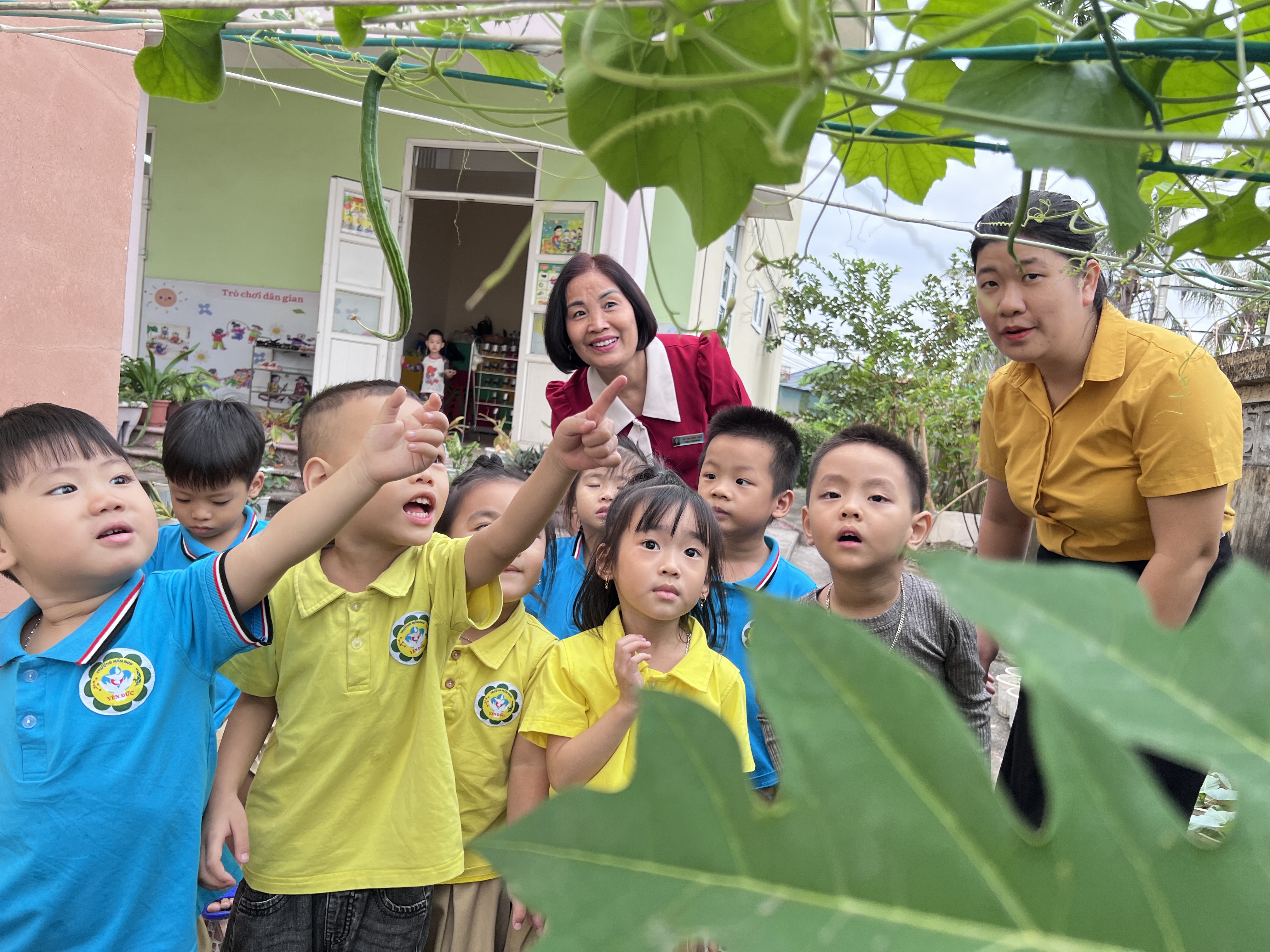 Hoạt động dạo chơi ngoài trời quan sát vườn rau, hoa của lớp 4-5 tuổi B2 Trường Mầm non Yên Đức